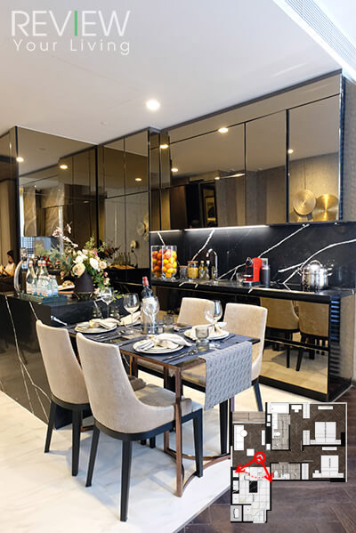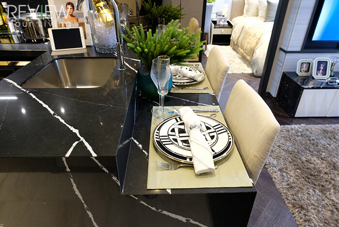ด้วยขนาดห้องที่ใหญ่ขึ้นทำให้ได้ Counter แบบ Island เล็กๆ เพิ่มขึ้นมาด้วย แถมยังสามารถวางโต๊ะรับประทานอาหารสำหรับ 4 ที่นั่งได้สบายๆ
