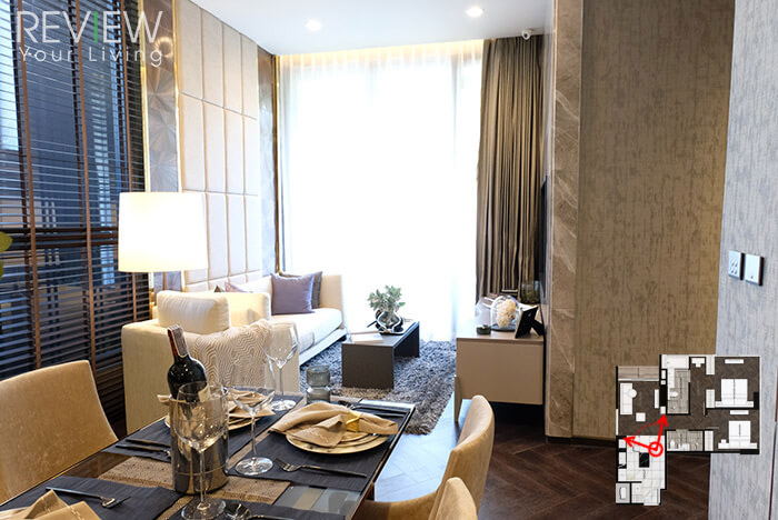 สำหรับห้องตัวอย่างสุดท้ายที่เราจะพาไปดู เป็นห้อง 2 Bedroom ขนาด 73.50 ตร.ม. ลักษณะแปลนด้านหน้าจะเป็นห้องแคบลึก แต่เมื่อเดินเข้าไปจะเป็นพื้นที่กว้างแบบสี่เหลี่ยมจัตุรัส บรรยากาศโดยรวมในห้องนี้จึงให้ความรู้สึกโปร่งโล่งสบายตา การจัดแบ่งพื้นที่ก็เป็นสัดส่วนชัดเจน เปิดห้องเข้ามาเจอส่วนครัวและมุมรับประทานอาหารเลย ซึ่งสามารถจัดวางพื้นที่ดินเนอร์สำหรับ 4 คนได้สบายๆ ถัดไปนั้นเป็นมุมนั่งเล่นที่กว้างพอให้วางโซฟาตัวยาวขนาดใหญ่ได้เลย แถมยังแอบเหลือพื้นที่สำหรับวางโต๊ะข้างและโต๊ะกลางได้อีกด้วย