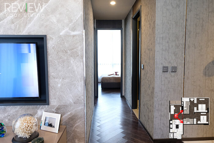 พื้นที่อีกโซนหนึ่งลึกเข้าไปจะเป็นห้องน้ำ, ห้องนอนเล็ก ซึ่งภายในห้องจะบิลต์อินตู้เสื้อผ้ามาให้เรียบร้อยแล้วค่ะ ส่วนห้องนอนใหญ่เปิดประตูเข้าไปจะเจอส่วน Walk-in Closet ก่อนเลยค่ะ ซึ่งก็มีมุมแต่งตัวพร้อมห้องน้ำส่วนตัว ก่อนจะจัดพื้นที่พักผ่อนไว้ด้านในสุด