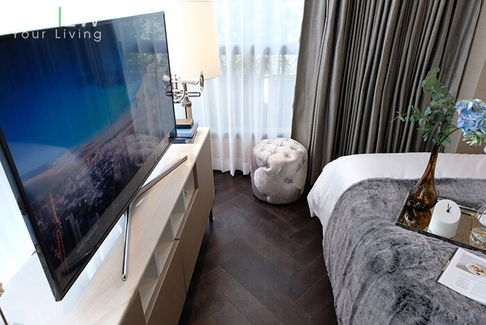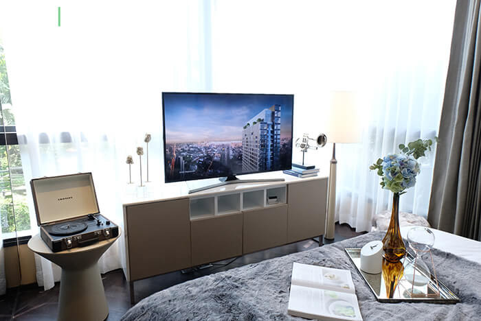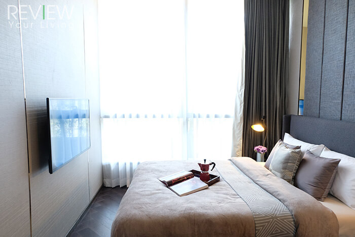 พื้นที่ใช้สอยปลายเตียงสามารถวางตู้คอนโซลทีวีพร้อมโคมไฟตั้งพื้นได้สบายๆ ติดกันจะมีหน้าต่างไว้รับแสงธรรมชาติและเปิดระบายอากาศ เป็นแบบเดียวกับห้องนอนเล็กเลย ทำให้สามารถนอนชมวิวจากบนเตียงได้
