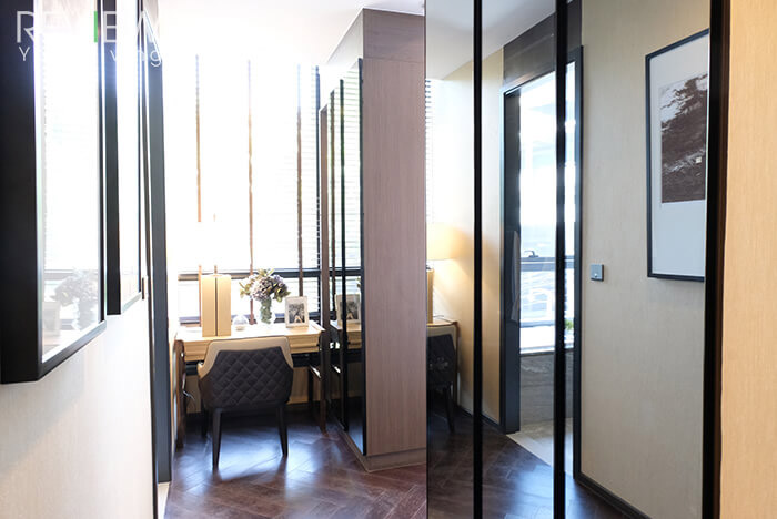 พื้นที่ส่วนพักผ่อนจะถูกเว้นให้เป็นทางเดินระหว่างตู้เสื้อผ้าเข้าไปด้านในนะคะ ซึ่งทางโครงการ Built-in ตู้เสื้อผ้าไว้ให้เรียบร้อยแล้วค่ะ