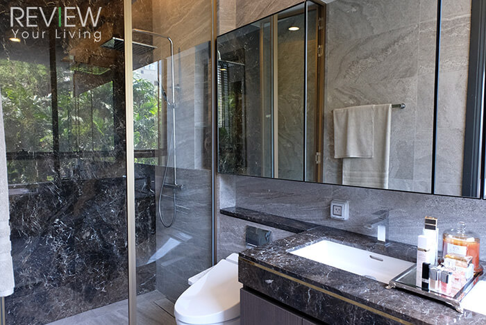ภายในห้องน้ำจะตกแต่งด้วยหินทั้งหมด โทนสีที่นำมาใช้ดูสะอาดตาและเลือกคู่สีได้ค่อนข้างดีเลยค่ะ การวางฟังก์ชันโดยรวมใช้งานได้ดีทุกส่วน