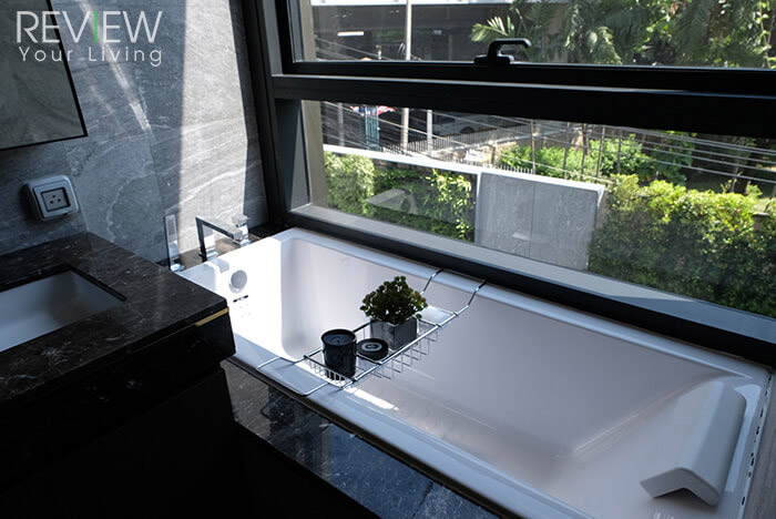 ตำแหน่งของ Bathtub จะอยู่ติดกับหน้าต่างกระจกใสนะคะ ซึ่งช่วยเปิดมุมมองของวิวด้านนอก หากต้องการความเป็นส่วนตัวก็สามารถติดฟิลม์หรือมูลี่ได้ค่ะ
