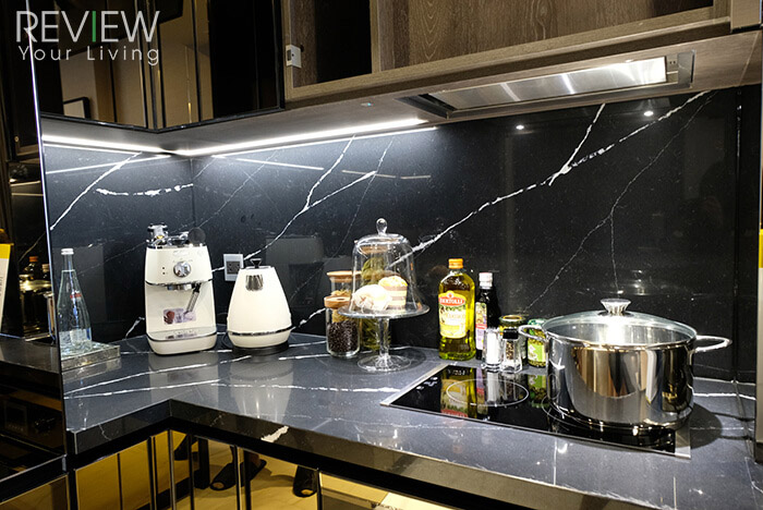 Top Counter วัสดุจะเป็น Composite Quartz ที่เป็นลายต่อเนื่องกันเหมือนในห้องตัวอย่างเลยนะคะ เวลาปรุงอาหารแล้วกระเด็นก็สามารถเช็ดทำความสะอาดได้ง่าย
