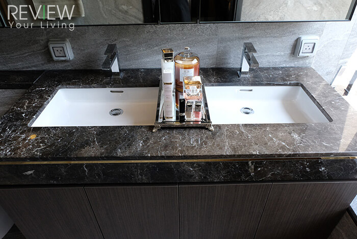 อ่างล้างหน้าจะเป็นแบบ His & Hers ด้านหลังมีตู้เก็บของที่ได้หน้าบานเป็นบานกระจกค่ะ