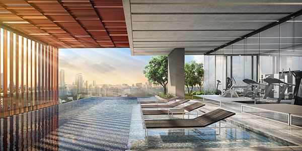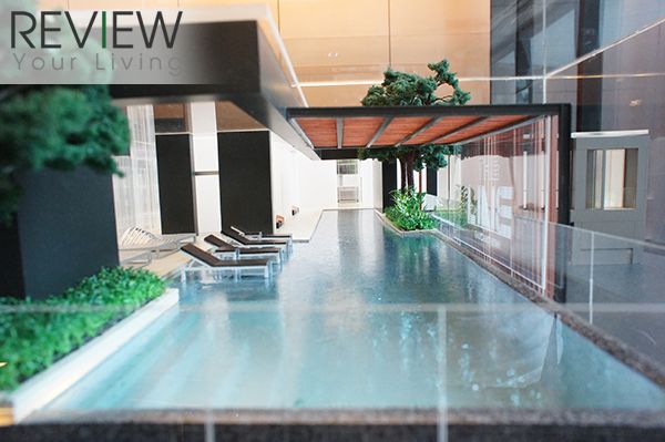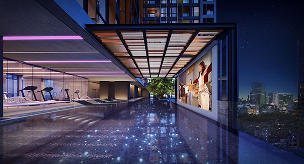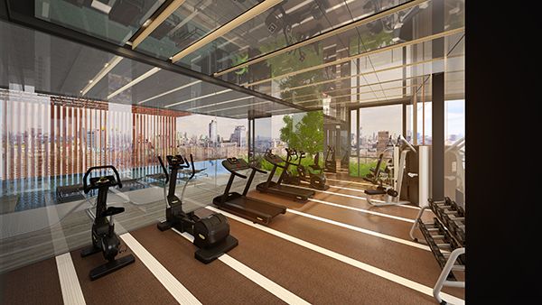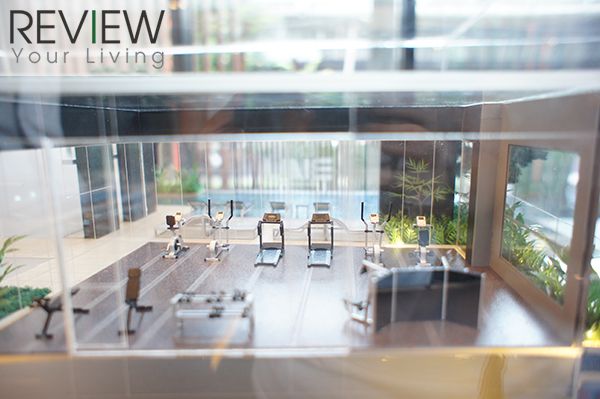 โมเดลจำลองฟิตเนสบนชั้น 11 ที่มองออกไปเห็นสระว่ายน้ำที่อยู่ด้านนอก