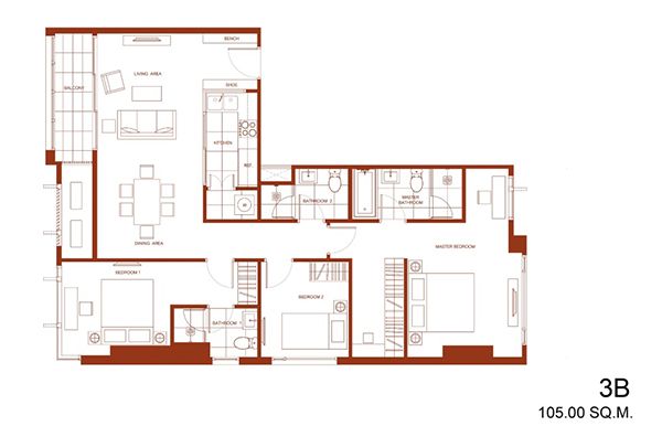 แปลนห้อง Type 3B 3 ห้องนอน 3 ห้องน้ำ ขนาด 105 ตารางเมตร