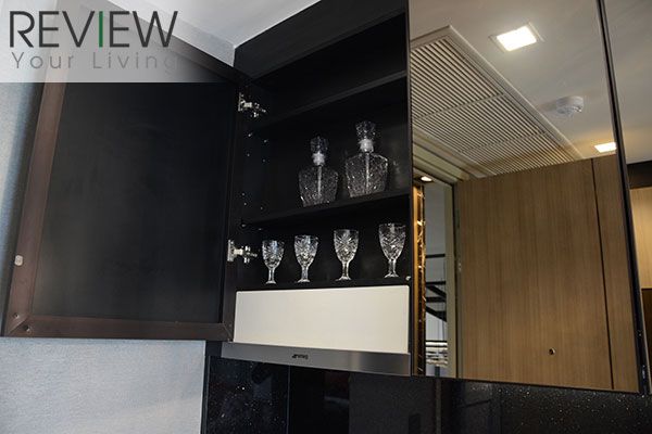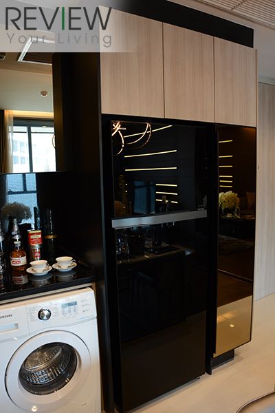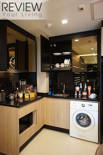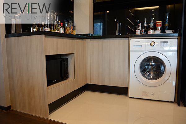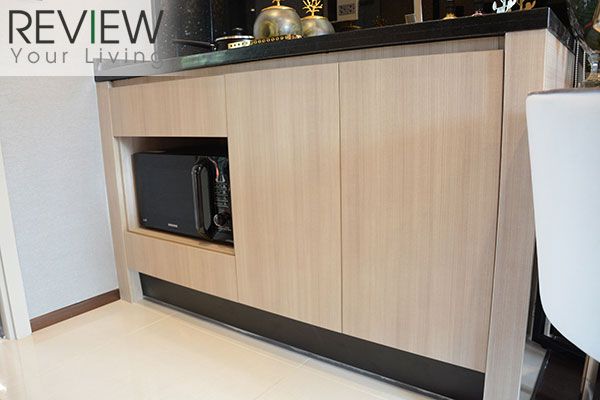 ด้านล่างจะเป็นตู้เก็บของ พร้อมจุดวางไมโครเวฟ และเครื่องซักผ้า