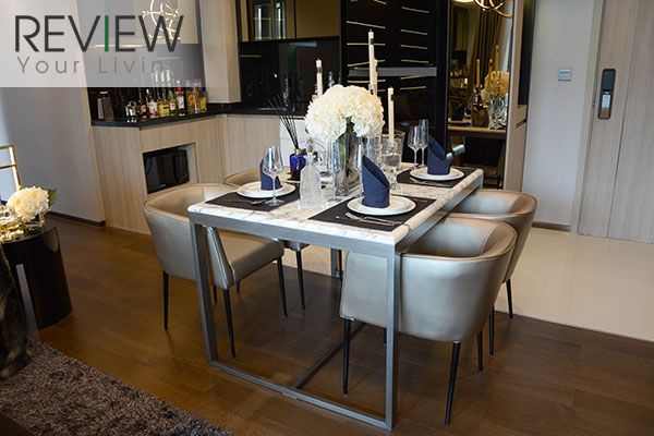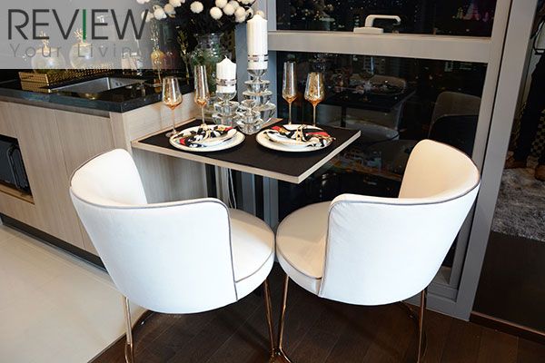 ขยับออกมาทาง Living Area จะเป็นจุดวางโต๊ะทานอาหาร ขนาด 4 ที่นั่ง อยู่ตรงกลางระหว่างครัวกับ Living Area