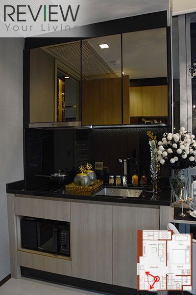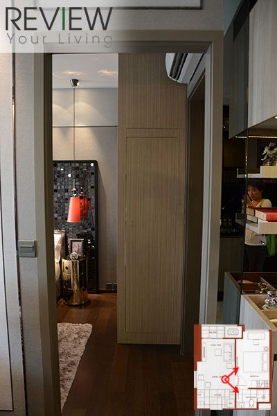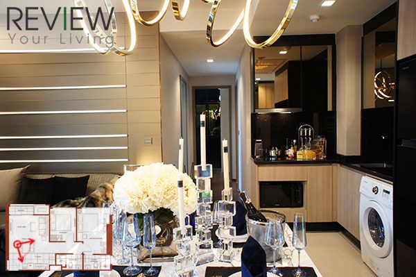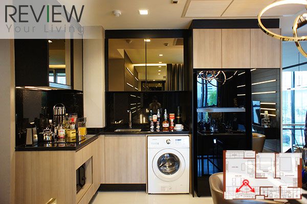 เมื่อเปิดประตูเข้ามาในห้องแล้วจะเจอส่วนครัวอยู่ด้านหน้า มองตรงเข้าไปด้านในถึงจะเป็น Living Area