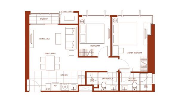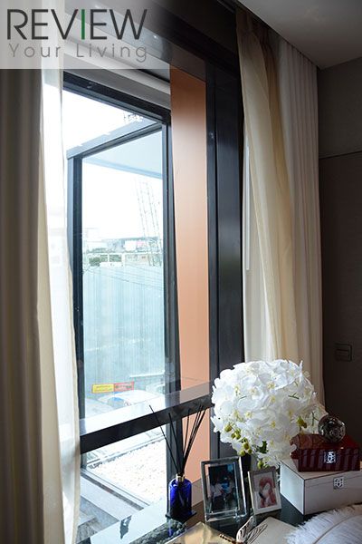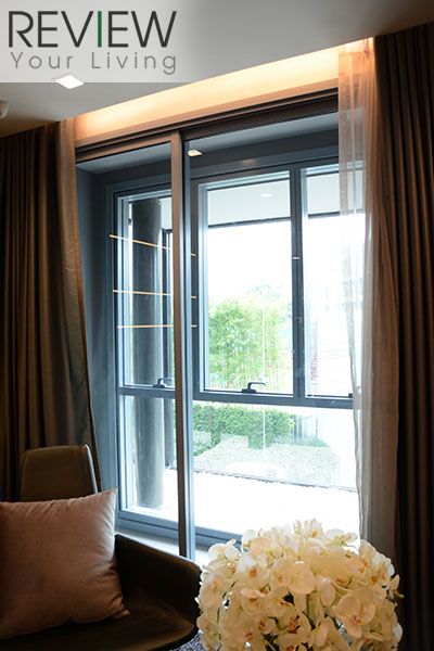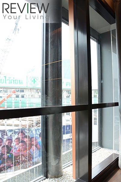 จะสังเกตว่าที่ระเบียงจะมีกระจกกั้นอีก 1 ชั้นนะครับ เพราะห้องแบบ 2 ห้องนอน เกือบทั้งหมดจะอยู่ทิศใต้ หันไปทางวังสระปทุม จึงต้องมีกระจกกั้นไว้อีกชั้น ซึ่งจะเป็นบานกระทุ้ง 3 บาน สามารถเปิดได้ประมาณ 30 องศา