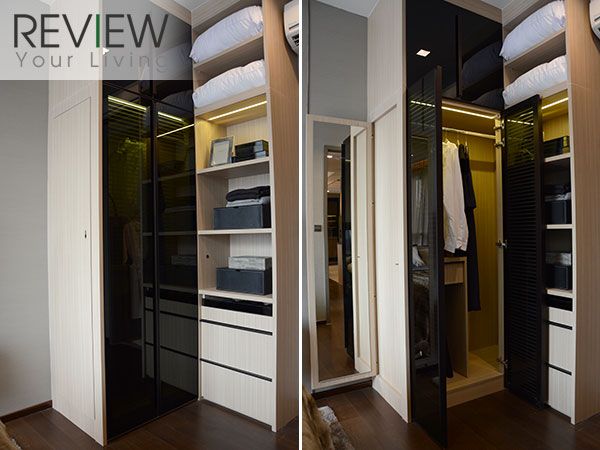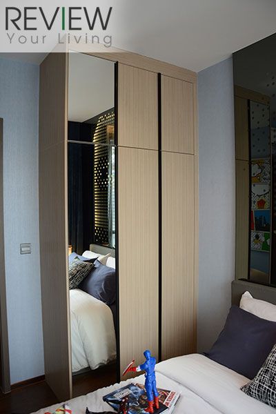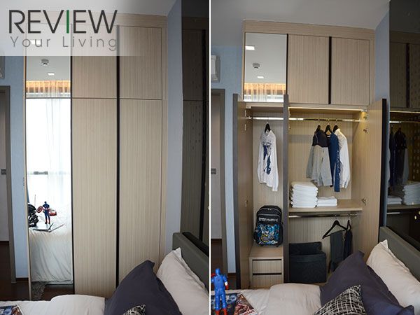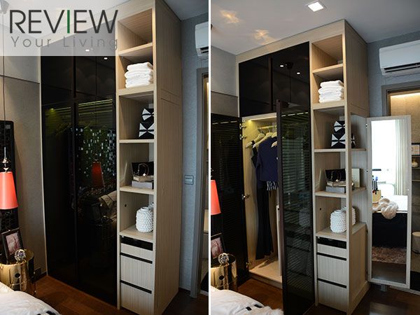 ตู้เสื้อผ้าจะคล้ายๆ กับของห้อง 1 ห้องนอนนะครับ หน้าบานเป็นกระจกสีชา มีชั้นวางของอยู่ด้านข้าง
