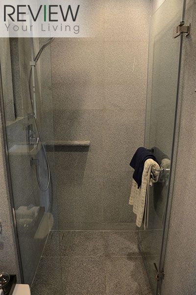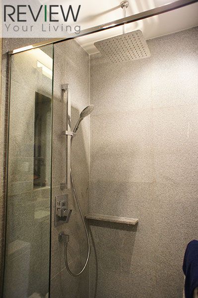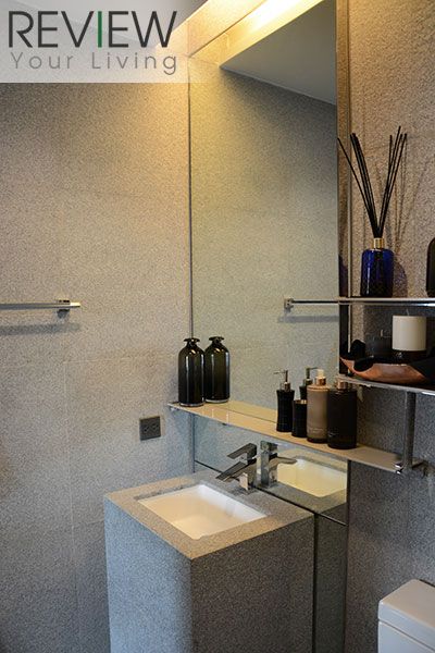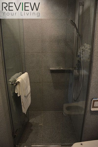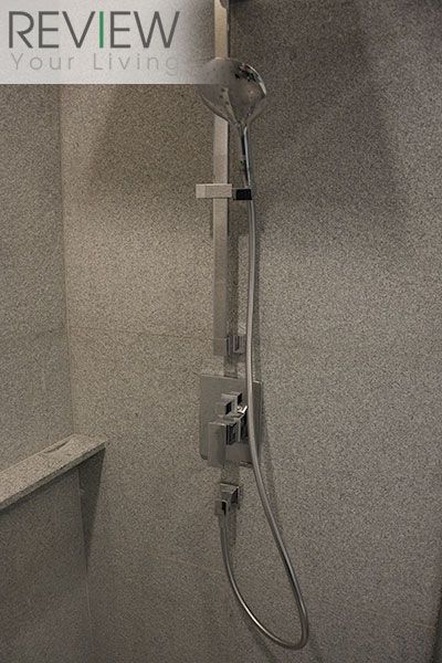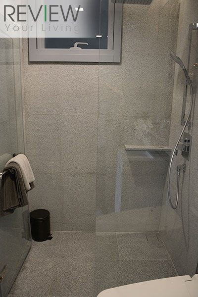 ภายในห้องน้ำจะปูด้วยหินแกรนิต Misty Grey ทั้งห้องเลยนะครับ ทั้งพื้นและผนัง จะมีความแตงต่างกันตรงที่ผิวของกระเบื้อง บริเวณผนังห้องจะมีผิวขรุขระให้ความรู้สึกเหมือนหินจริงๆ ส่วนที่พื้นจะเป็นผิวเรียบ