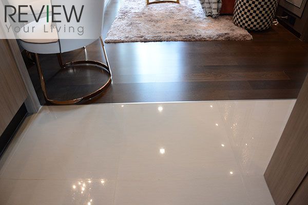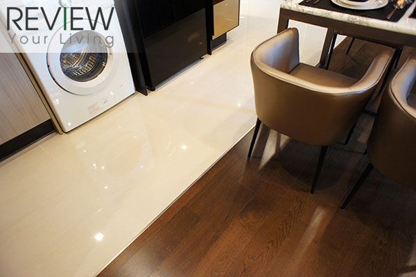 พื้นที่ส่วนครัวจะปูด้วยกระเบื้องเซรามิคสีขาว ส่วนพื้นที่ Living Area จะเป็น Engineering Wood สีไม้โอ๊ค