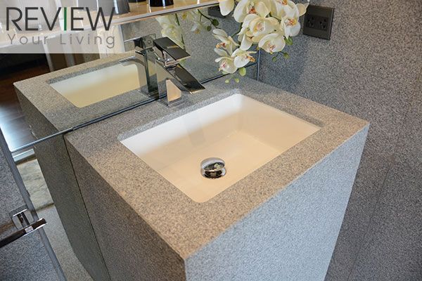 อ่างล้างหน้าทรงสี่เหลี่ยมของ Cotto ตัวเคาน์เตอร์จะเป็นหินแกรนิตเหมือนที่ปูผนังห้องน้ำ