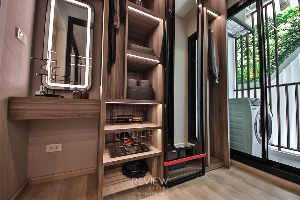 Smart Walk in Closet เป็นตู้เสื้อผ้าที่ไม่ได้มีไว้แค่เก็บเสื้อผ้าเท่านั้น เป็นทั้งตู้เก็บของ เก็บเสื้อผ้า และโต๊ะเครื่องแป้งใน 1 เดียว ทั้ง Beauty Mirror พร้อมไฟ LED รอบกระจก ช่องปลั๊กที่เตรียมไว้ทุกมุม ด้านบนสำหรับเสียบไดร์เป่าผม และด้านล่างสำหรับเสียบ iRobot Clenning ช่องเก็บเสื้อผ้าหลายขนาด หลายไซท์ ทั้งหมุดแขวนหมวกหรือเข็มขัด เรียกว่าคิดมาครบให้เก็บทั้งเสื้อผ้าและของใช้ได้ทุกอย่างจริงๆ ซึ่งโครงการบิ้วท์อิน มาให้เหมือนในห้องตัวอย่างเลย ขาดเพียงกระจกเงาสูงเต็มตัวด้านใน ที่ติดไว้เป็นไอเดียเท่านั้น