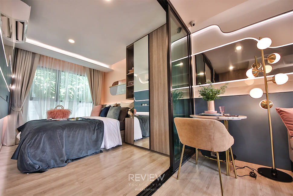 Bedroom กั้นด้วยประตูกระจกบานเลื่อน ขอบอลูมิเนียมสีดำ พื้นที่เชื่อมต่อกับ Living Room โดยจะได้ Built in ตู้เสื้อผ้า เตียงขนาด 5 ฟุต ส่วนหน้าต่างข้างเตียงใช้กระจกบานกระทุ้ง
