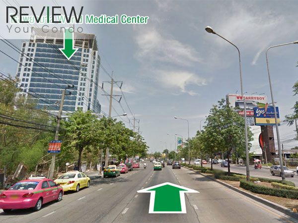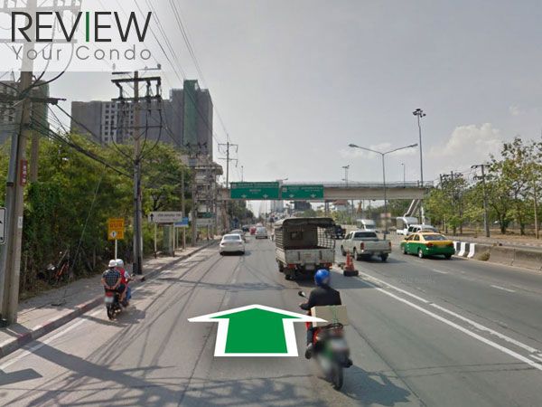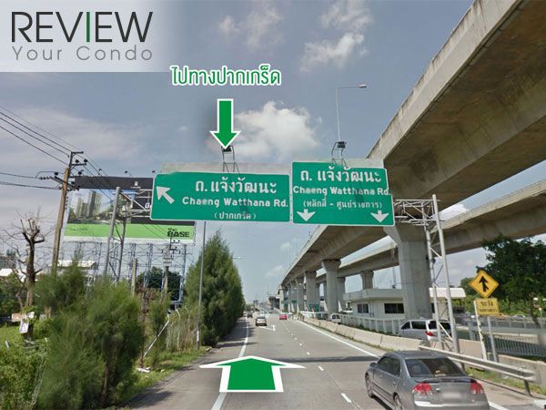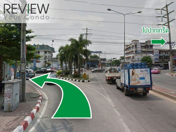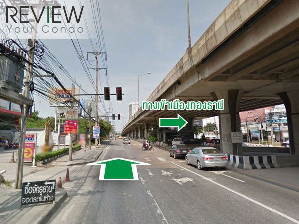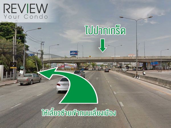 เมื่อเลยตึกจัสมินมาก็จะเห็นสะพานลอย ให้ชิดซ้ายเพื่อเลี้ยวเข้าถนนเลี่ยงเมืองปากเกร็ด