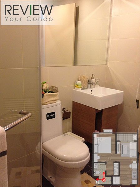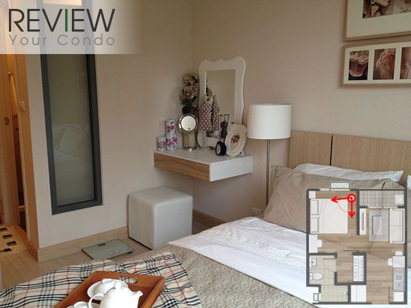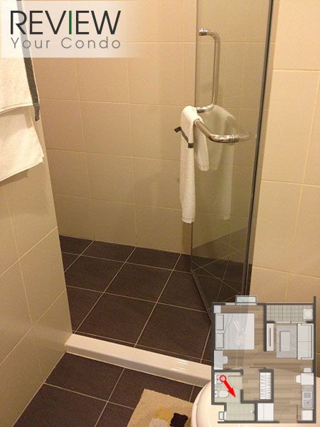 ถัดเข้ามาดูที่ห้องนอนกันบ้างครับ พื้นที่ห้องนอนไม่ได้กว้างมากนัก วางเตียงขนาด 5-6 ฟุตเข้าไปก็เกือบจะไม่เหลือพื้นที่ปลายเตียงแล้ว แต่กลับกันพื้นที่ห้องที่มีลักษณะลึกเป็นแนวยาวมากกว่า บริเวณหน้าห้องน้ำจึงมีพื้นที่มากพอที่จะวางตู้เสื้อผ้าใหญ่ได้ 2 ตู้ เลยทำให้เหมือนได้พื้นที่แต่งตัวแบบ walk in closet เพิ่มขึ้นมา ส่วนในห้องน้ำก็จัดพื้นที่แยกส่วนแห้งส่วนเปียกไว้เรียบร้อย มี Shower Box ติดตั้งมาให้พร้อมชุดสุขภัณฑ์มาตรฐาน แต่ไม่มีเครื่องทำน้ำอุ่นมาให้นะครับ อันนี้ต้องไปติดเพิ่มกันเอง อ้อ! อีกอย่างที่ติดตั้งมาให้พร้อมห้องเลยก็คือ Digital Door Lock ที่สามารถใช้ได้ทั้งระบบ Key Card และกดรหัสเข้าห้อง