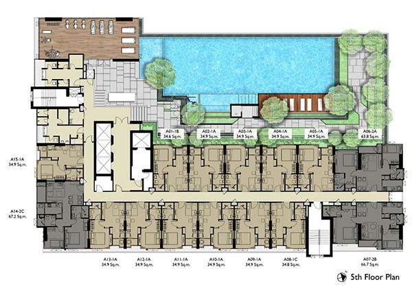 ที่ชั้น 5 อย่างที่บอกจะเป็นชั้นที่รวม Facility หลักของโครงการไว้ทั้งสระว่ายน้ำ ฟิตเนส และห้องอบไอน้ำ รวมถึงเป็นชั้นที่เริ่มต้นของห้องพักอาศัยด้วย