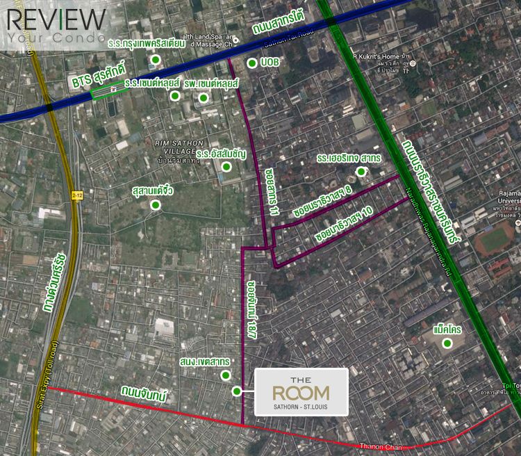 เลี้ยวเข้าซอยจันทน์ 18/7 มาประมาณ 150 เมตร จะเห็นป้ายคอนโด The Room สาทร-เซนต์หลุยส์อยู่ตรงหัวมุมจันทน์ 18/7 แยก 1 ชัดเจน