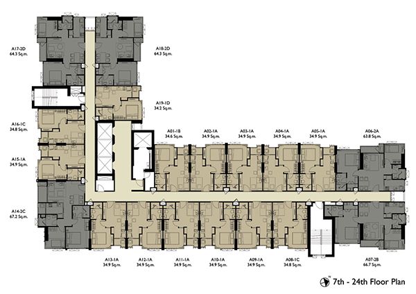 ตั้งแต่ชั้น 7-24 จะเป็นห้องพักอาศัยทั้งหมด จะมีลิฟท์ทั้งหมด 4 ตัว เป็นลิฟท์โดยสาร 3 ตัวและ Service Lift อีก 1 ตัว