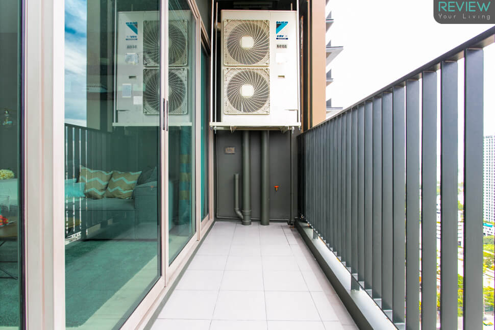 พื้นระเบียงปูด้วยกระเบื้องเซรามิค กับราวกันตกเป็นราวเหล็กโปร่ง ส่วนของระเบียงยังสามารถวางราวตากผ้าได้ กำแพงริมระเบียงติดตั้ง Condensing Unit จะสังเกตเห็นได้ว่าข้างล่างมีก๊อกน้ําและรูปลั๊กไฟเหลือพื้นที่พอสำหรับเครื่องซักผ้า