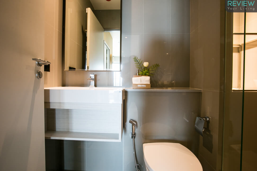 โถสุขภัณฑ์จากแบรนด์ Toto บริเวณข้างหลังที่ยื่นมาเป็นถังพักน้ำไว้เก็บท่อน้ำแบ่งน้ำดีน้ำเสีย และยังช่วยเพิ่มพื้นที่ในการวางของได้อีกด้วย