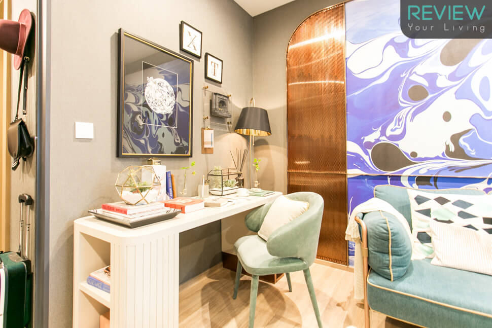 โต๊ะทำงานวางไว้ข้างโซฟา ทำให้ห้องนี้เหมาะกับคนทำงานที่ไม่ต้องการบรรยากาศที่เคร่งเครียดมากจนเกินไปค่ะ