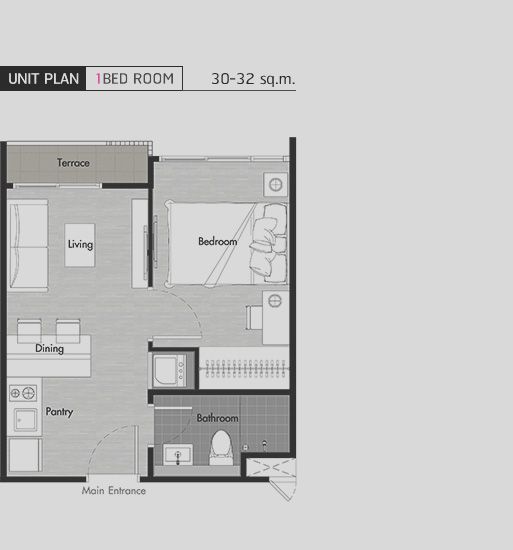 - 1 ห้องนอน 1 ห้องน้ำ ขนาด 30 – 32 ตารางเมตร
