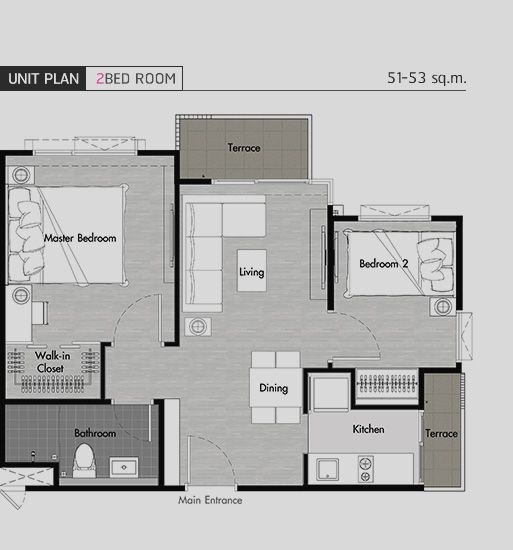 - 2 ห้องนอน 2 ห้องน้ำ ขนาด 51 – 53 ตารางเมตร