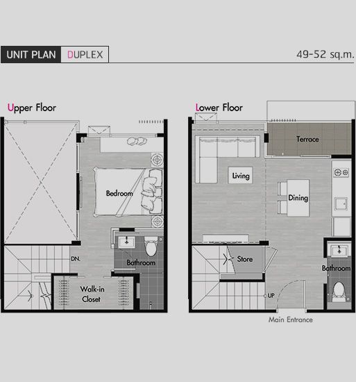 - Duplex 1 ห้องนอน 2 ห้องน้ำ ขนาด 49 – 52 ตารางเมตร
