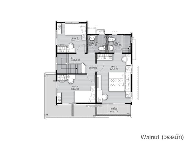 - Walnut พื้นที่ใช้สอย 136 ตร.ม. ขนาดที่ดิน 52 ตร.ว. 3 ห้องนอน 3 ห้องน้ำ 2 ที่จอดรถ