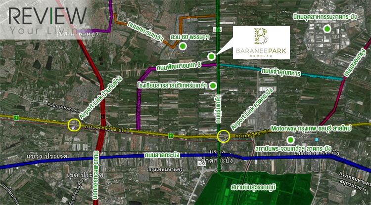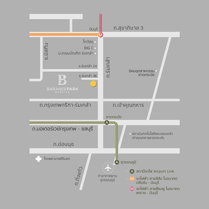 ตัวโครงการ Baranee Park ร่มเกล้า ตั้งอยู่ริมถนนร่มเกล้าใกล้แยกเจ้าคุณทหาร ช่วงระหว่างซอยร่มเกล้า 36 และ 38 การเดินทางสะดวกสบายด้วยถนนร่มเกล้า, ถนนมอเตอร์เวย์ กรุงเทพ-ชลบุรี, ถนนกรุงเทพกรีฑา, ถนนเจ้าคุณทหาร, ถนนอ่อนนุช และถนนสุขาภิบาล 3 รวมถึงมีรถไฟฟ้า Airport Link สถานีลาดกระบังอยู่ห่างออกไปไม่ไกล และยังเป็นจุดเชื่อมต่อรถไฟฟ้าสายสีส้ม (ตลิ่งชัน-มีนบุรี) และสายสีชมพู (แคราย-มีนบุรี) ในอนาคตอีกด้วย