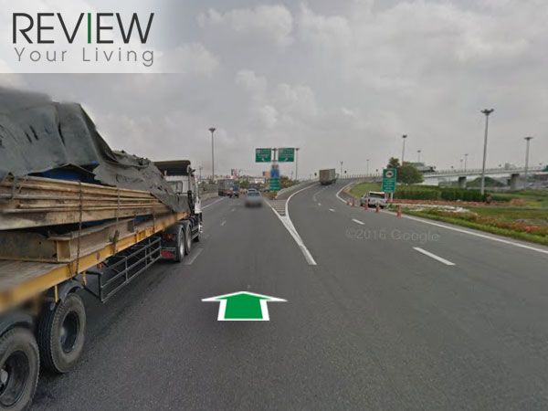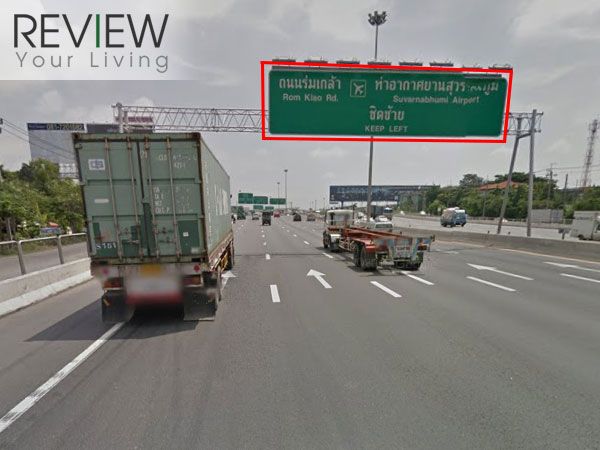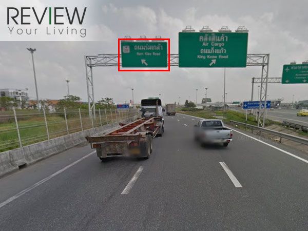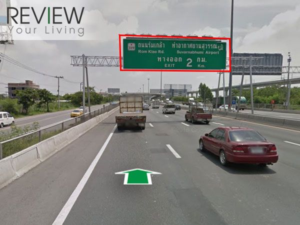 ขับมาเรื่อยๆ จนเจอป้ายทางออกถนนร่มเกล้า ซึ่งจะออกทางเดียวกันกับสนามบินสุวรรณภูมิ