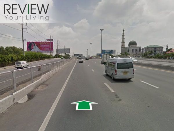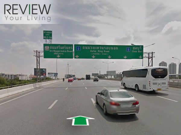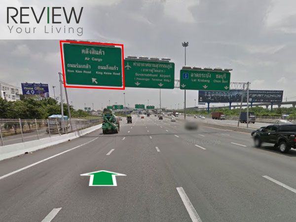 เราต้องไปทางซ้ายเพื่อไปทางถนนร่มเกล้า ส่วนทางขวาจะไปสนามบินสุวรรณภูมิและถนนกิ่งแก้ว