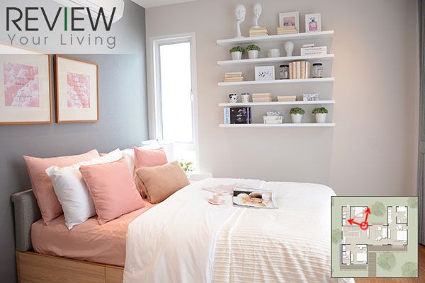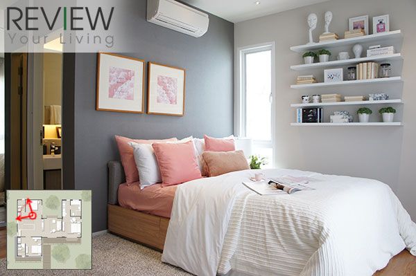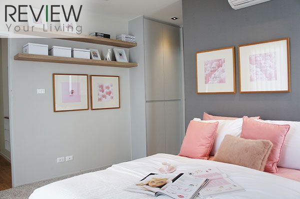 ภายในห้องมีห้องน้ำในตัว และเพิ่มพื้นที่เก็บของให้มากขึ้นด้วยการ Built-in ชั้นเก็บของมาเต็มพื้นที่ผนังเลยทีเดียว