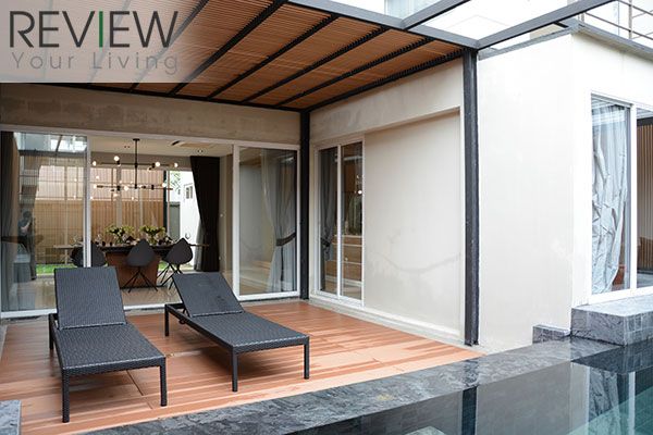 ในขณะที่อีกด้าน ตกแต่งใหม่ให้เป็นมุมนั่งเล่นพักผ่อนริมสระว่ายน้ำ ซึ่งเราสามารถเปิดประตูออกเพื่อเพิ่มพื้นที่ใช้สอยได้ตามต้องการ