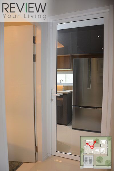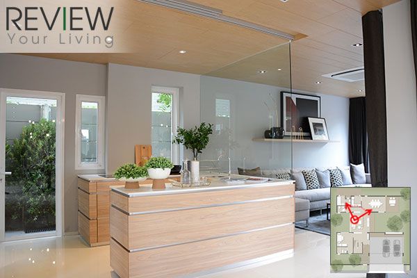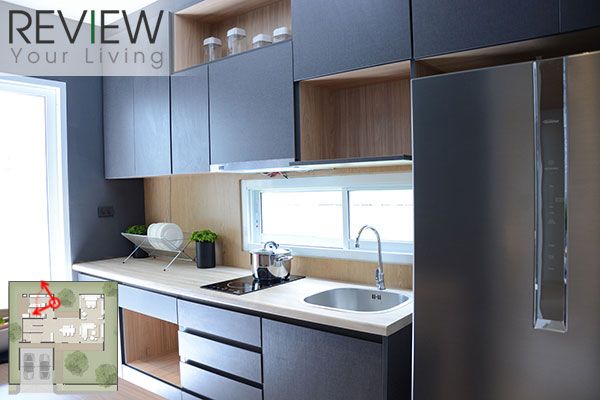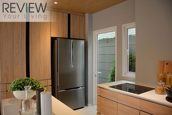 ห้องครัวจะอยู่ในส่วนแรกของตัวบ้านเลย ครัวออกแบบให้เป็นครัวปิด ติดตั้งประตูกระจกเพิ่มเพื่อช่วยป้องกันกลิ่นรบกวน