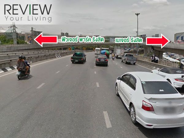 ขึ้นสะพานวนข้ามถนนพหลโยธินมาแล้วเราจะเข้าสู่ถนนรังสิตนครนายก ฝั่งซ้ายมือจะเป็นฟิวเจอร์ พาร์ค รังสิตและ Zpell ส่วนฝั่งขวามือจะเป็นเมเจอร์ รังสิต