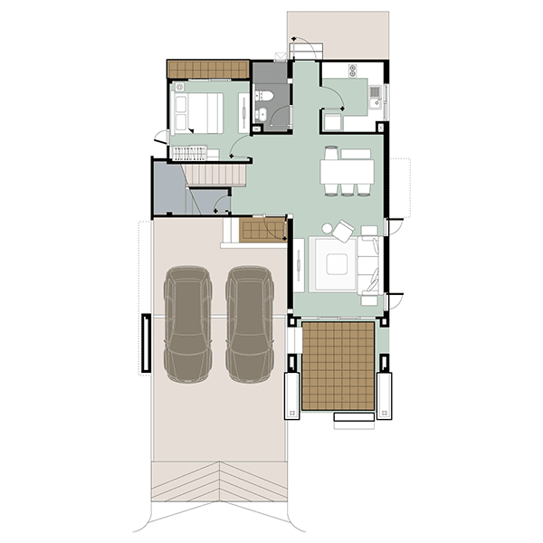 บริเวณชั้นล่างเสริมด้วยห้องนอนเล็ก 1 ห้อง ซึ่งสามารถจัดตกแต่งใช้เป็นห้องทำงาน หรือจะให้เป็นห้องนอนสำหรับผู้สูงอายุก็สะดวกดีทีเดียว ส่วนห้องน้ำของชั้นหนึ่งจะอยู่ตรงข้ามห้องครัว