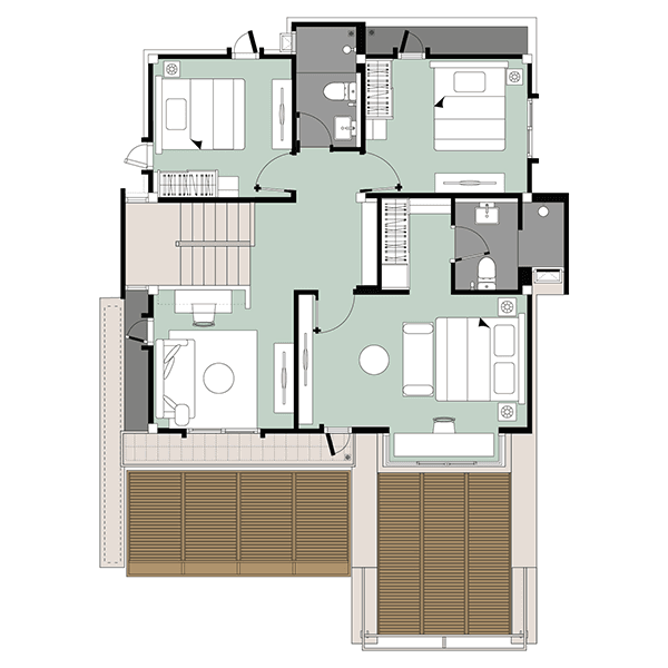 ขึ้นมาที่บริเวณชั้น 2 จะพบกับพื้นที่นั่งเล่นสำหรับการทำกิจกรรมร่วมกันของคนในครอบครัว ไม่ว่าจะเป็นนั่งดูทีวี พูดคุยร่วมกัน หรือแม้แต่ใช้เป็นพื้นที่รับแขกคนสนิทแบบส่วนตัวก็ได้เช่นกัน ในขณะที่พื้นที่ของห้องนอนทั้ง 3 ห้องบนชั้น 2 ก็แบ่งพื้นที่กันไว้อย่างลงตัว ทั้งห้องนอนใหญ่ที่กว้างมากพอที่จะมีห้องอาบน้ำและ Walk-in Closet ในตัว ส่วนห้องนอนเล็กอีก 2 ห้องก็จัดไว้ในโซนด้านเดียวกันอย่างเป็นสัดส่วน โดยพื้นที่ทั้งหมดนี้เพียงพอต่อการรองรับสมาชิกของครอบครัวขนาดใหญ่ หรืออาจจัดสรรให้ใช้ประโยชน์ในด้านอื่นๆ ได้อีกถ้าเป็นครอบครัวขนาดเล็ก