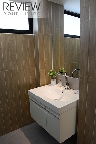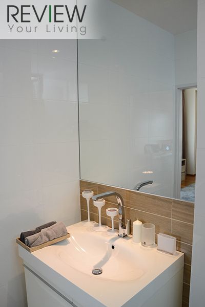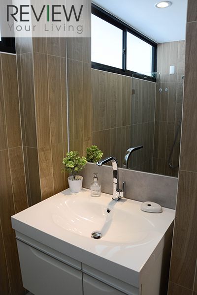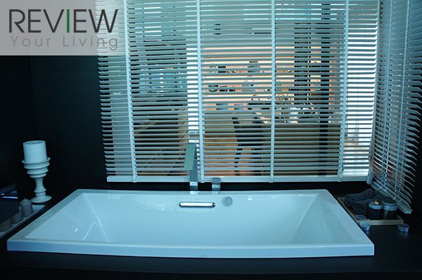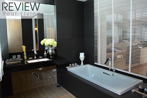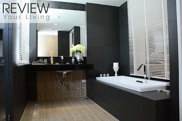 อีกด้านจะเป็นอ่างล้างหน้า และอ่างอาบน้ำ อยู่ติดกับผนังกระจก ภายในห้องน้ำจะตกแต่งด้วยดทนสีเข้ม ปูพื้นด้วยกระเบื้องลายไม้