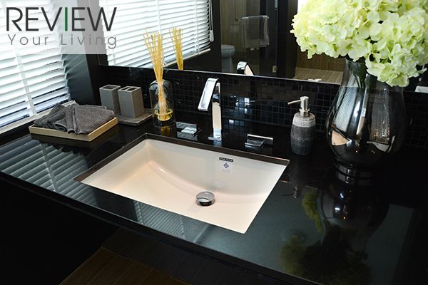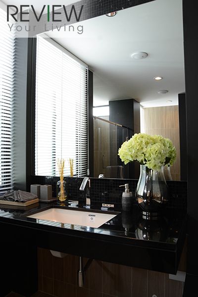 อ่างล้างหน้าจะเป็นทรงสีเหลี่ยมของ Kohler เหมือนกันนะครับ มาพร้อมเคาน์เตอร์สีดำเข้ม มีพื้นที่วางของเยอะเลยครับ
