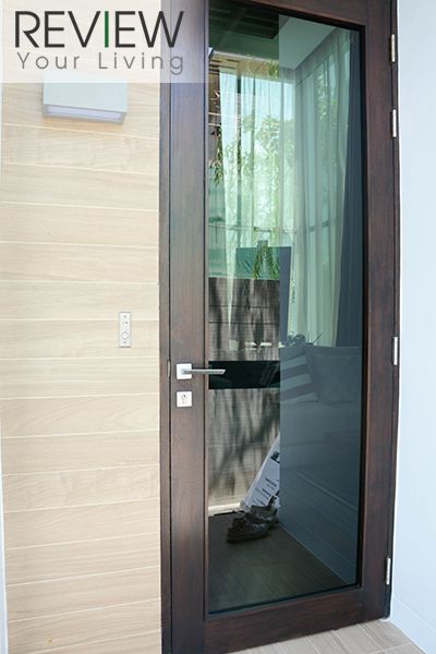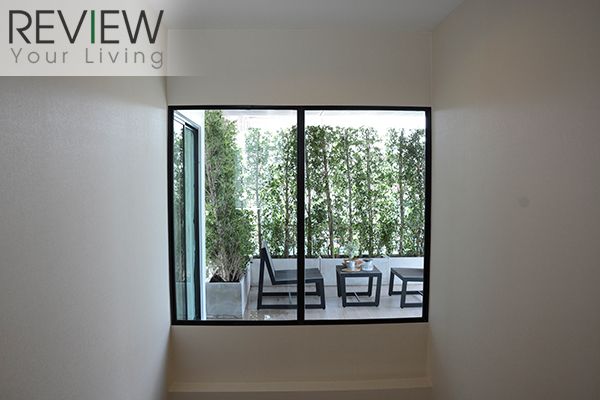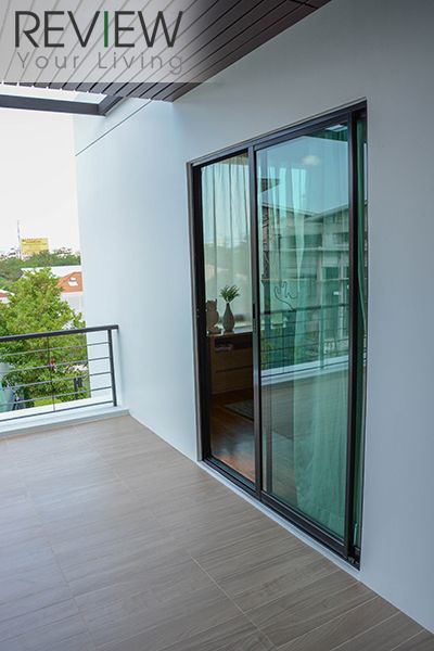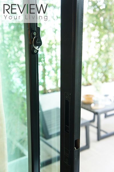 ประตูกระจกบานเลื่อนออกไปที่ระเบียงเป็นอลูมิเนียมสีดำ พร้อมระบบ Double Lock ตามภาพเลย