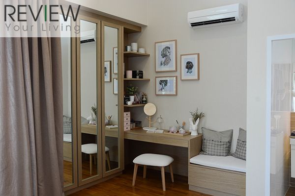 มุมห้องด้านซ้ายโครงการตกแต่งเป็นมุมแต่งตัว ที่มีตู้เสื้อผ้า โต๊ะเครื่องแป้งและเดย์เบดเล็กๆ อยู่รวมกัน ดูน่ารักดีนะครับ