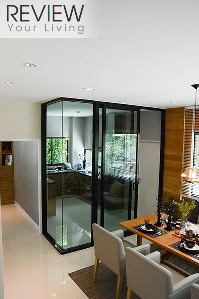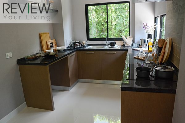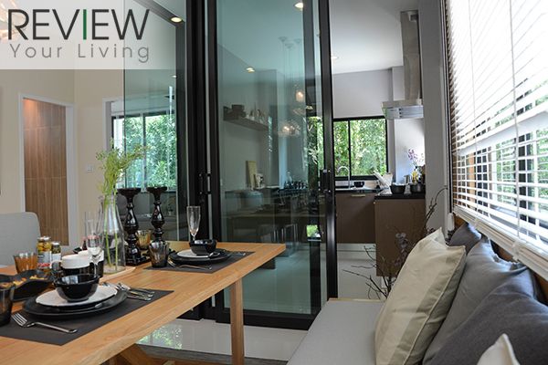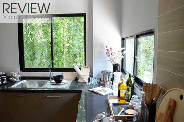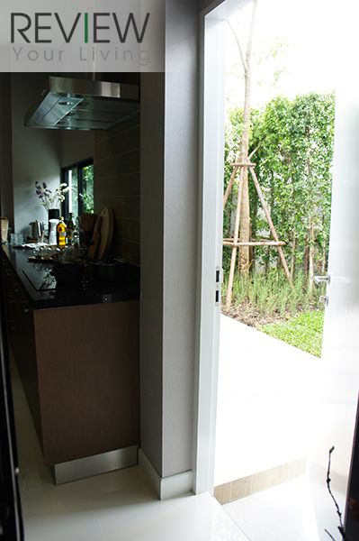 ห้องครัวในบ้านตัวอย่างจะทำเป็นประตูกระจกบานเลื่อน และกระจกเข้ามุม กั้นห้องครัวให้ดูเป็นสัดส่วนมากขึ้น แต่บ้านจริงไม่มีให้นะครับ
