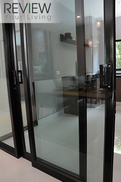 ประตูกระจกบานเลื่อนตรงห้องครัวเป็นอลูมิเนียมสีดำตามแบบเลยครับ