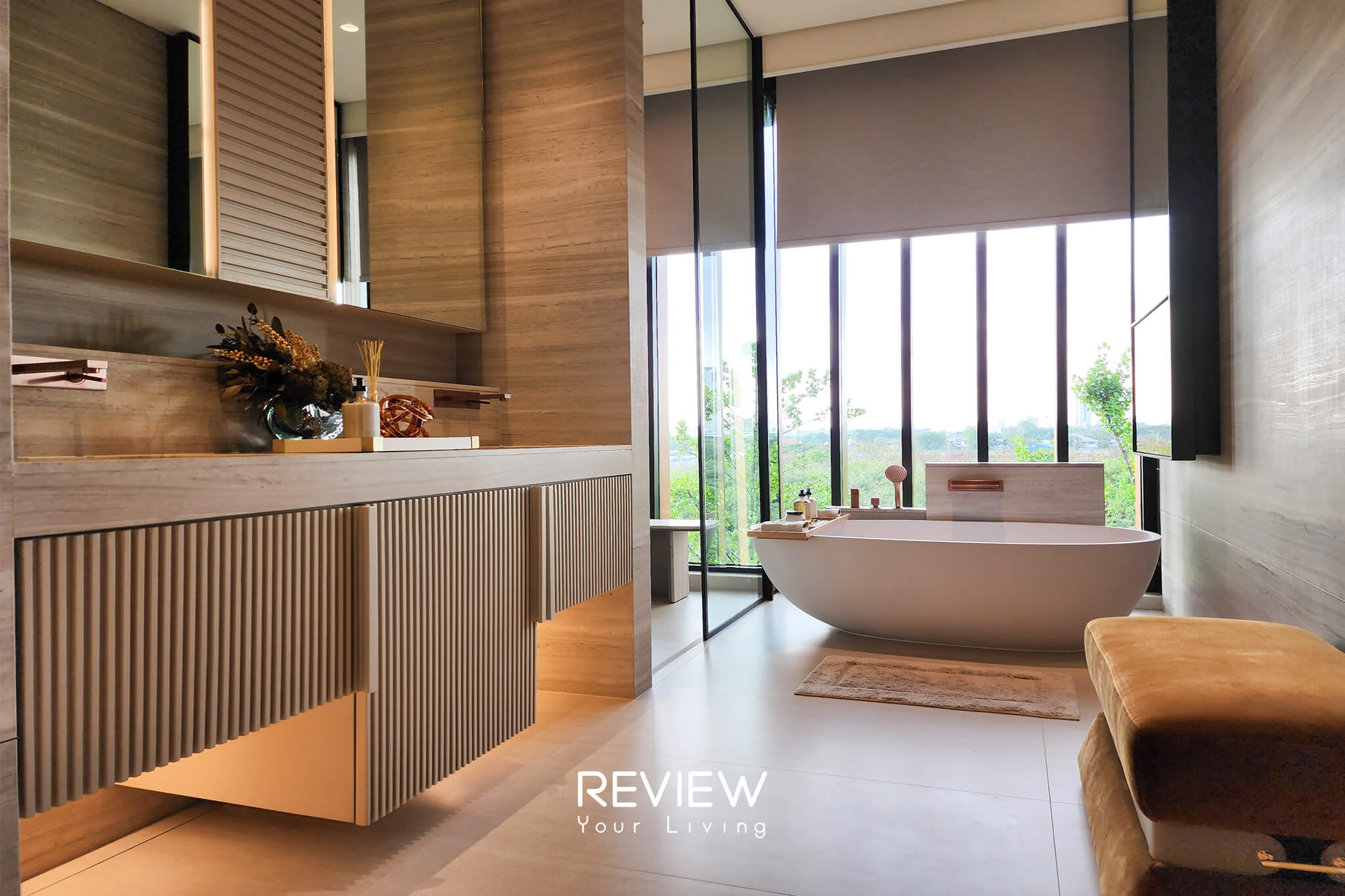 ที่ไม่พูดถึงไม่ได้เลยคือ Master Bedroom ซึ่งเป็นห้องที่ใหญ่ที่สุดของบ้าน แน่นอนว่านอกจาก Walk-in Closet ขนาดใหญ่ถูกใจคุณผู้หญิงแล้ว ทางโครงการยังคิดถึงฟังก์ชันการใช้งานในชีวิตประจำวันมาแบบรอบด้าน ไม่ว่าจะเป็นการวางงานระบบเตรียมพร้อมไว้ให้ด้วย เช่น โต๊ะแต่งหน้าที่หันเข้าหากระจกบานใหญ่เพื่อรับแสงธรรมชาติ มุมวางตู้แช่เครื่องสำอาง และอ่างล้างมือเล็กๆ บนโต๊ะเครื่องแป้งเพื่อการใช้งานที่สะดวกมากขึ้น ซึ่งถูกใจคุณผู้หญิงมากๆ อย่างแน่นอน รวมถึงการเจาะช่องแสงด้านบนเพื่อให้ภายในห้องรับแสงธรรมชาติได้มากขึ้น และยังเป็นการประหยัดการใช้ไฟในช่วงกลางวันได้อีกทาง ในขณะเดียวกันห้องน้ำของห้องนอนใหญ่ก็จัดเต็มทั้ง เคาน์เตอร์แบบ His & Her, Shower Box พร้อม Rain Shower และสุขภัณฑ์ที่สั่ง Custom มาเป็นพิเศษโดยเฉพาะ และอ่างอาบน้ำแบบลอยตัวจากแบรนด์ชั้นนำ ส่วนบริเวณห้องนอนการจัดวางตำแหน่งเตียงให้หันออกไปด้านนอกเพื่อเปิดรับวิวจากด้านนอกได้อย่างเต็มที่ และด้วยกระจกใสบานใหญ่รอบด้านทำให้บรรยากาศภายในห้องโปร่งสบายตาเป็นพิเศษอีกด้วย