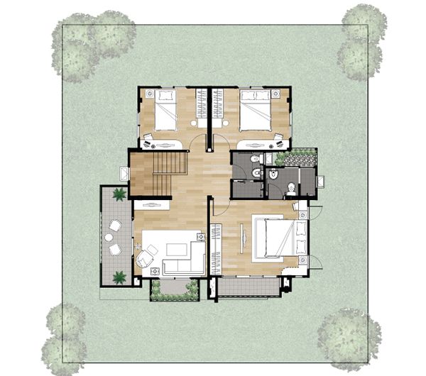 - Type J พื้นที่ใช้สอย 162 ตารางเมตร ขนาดที่ดิน 52-74 ตารางวา 3 ห้องนอน 3 ห้องน้ำ ที่จอดรถ 2 คัน